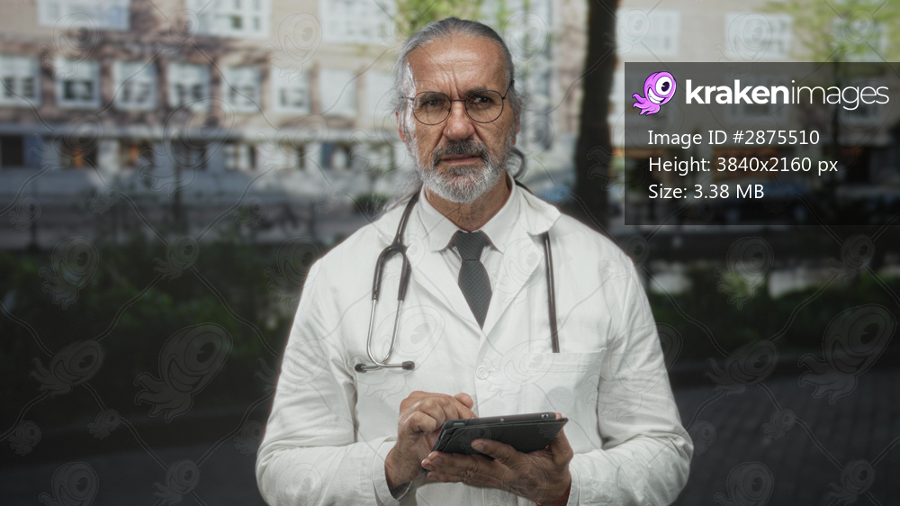 Man doctor in white coat taps tablet on city street by canal in amsterdam with stethoscope visible; focused medical care.