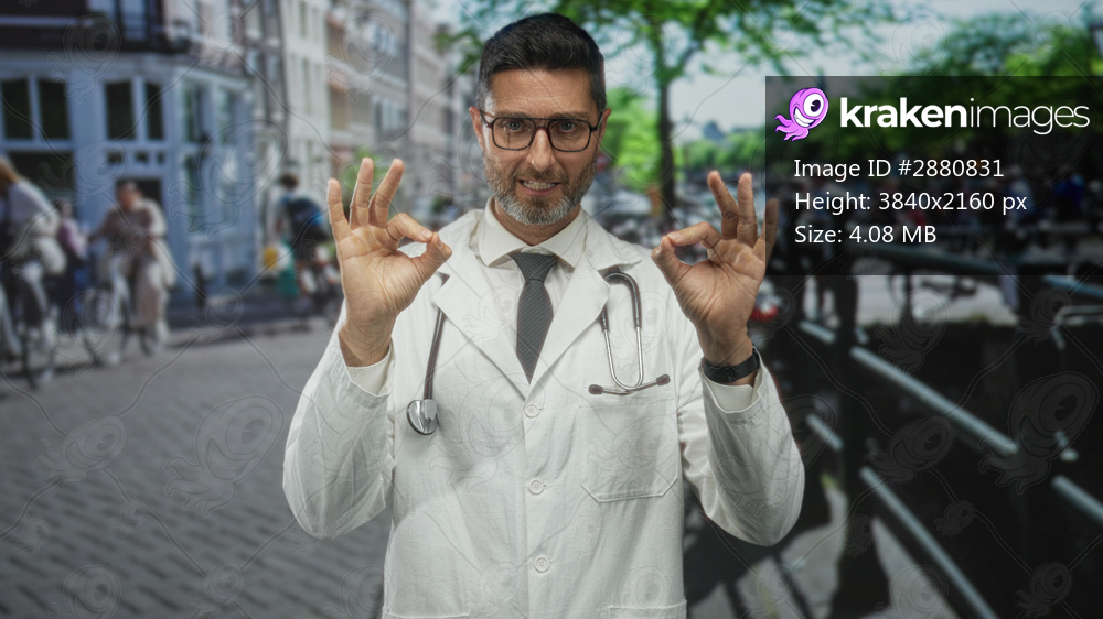 Man doctor in white coat and tie with stethoscope, glasses and beard making ok hand gesture on street; confidence reassurance wellness.