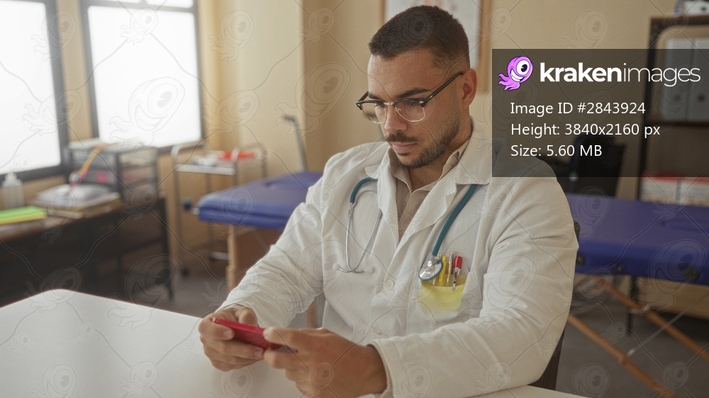 Man doctor in white coat wearing eyeglasses holds smartphone at desk in clinic; compassion focus dedication care.