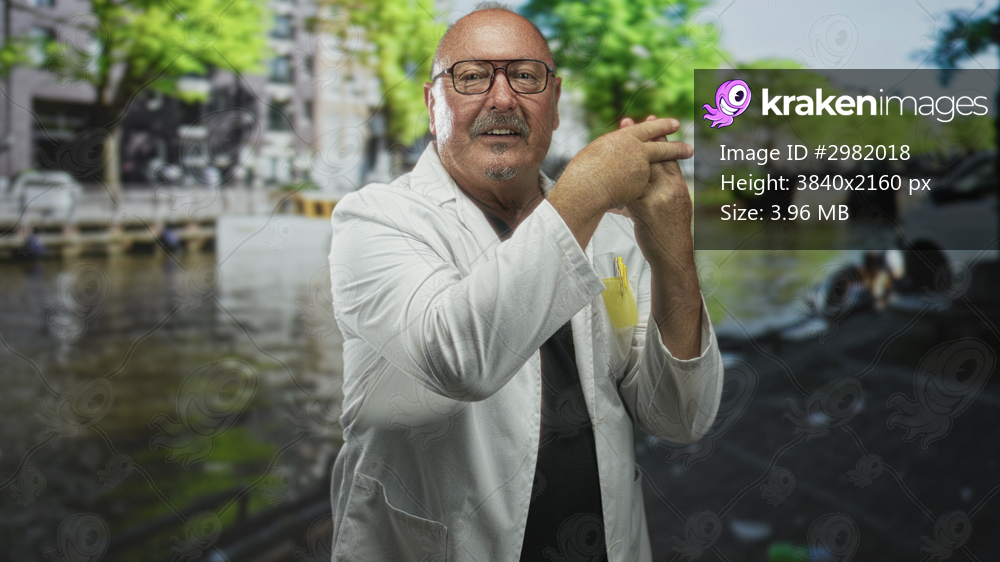 Man doctor in white coat wearing glasses and clasping hands with pens in pocket beside a canal on a city street; trust compassion.