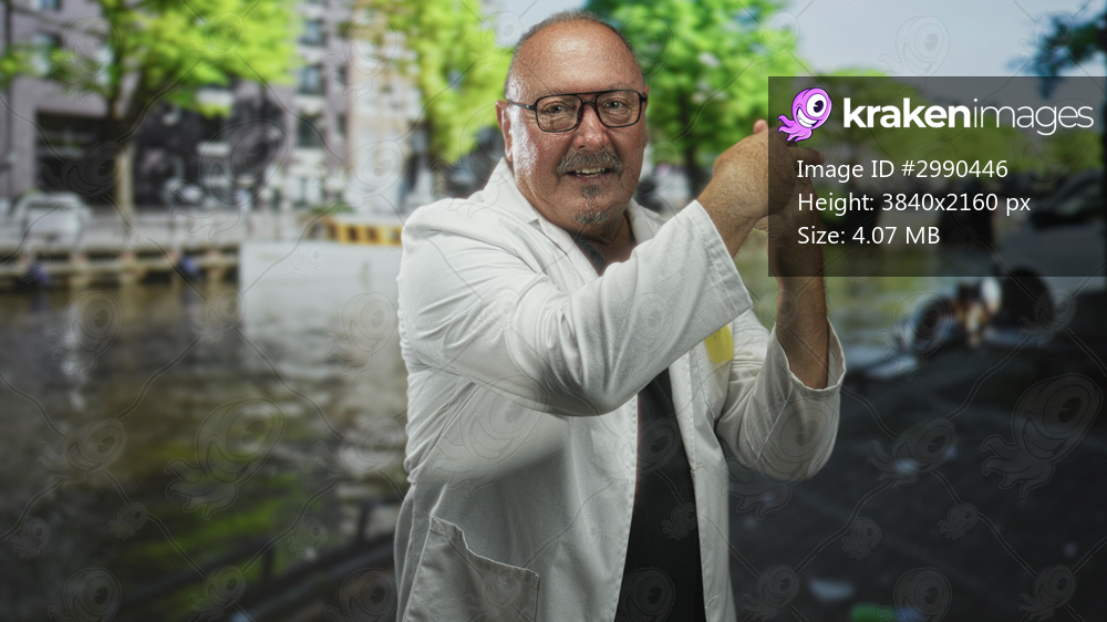 Man doctor in white coat wearing glasses and clasping hands with pens in pocket beside a canal on a city street; trust compassion.