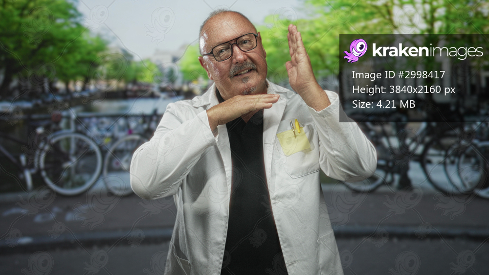Man doctor in white lab coat framing his face with hands, pen and sticky note in chest pocket, smiling amid bicycles by a canal on a street; playful compassion. - Kraken Images