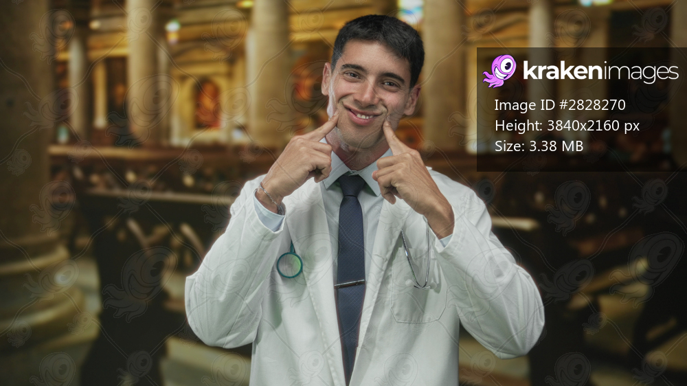 Man doctor in white lab coat with stethoscope points fingers to cheeks inside building; playful amusement.