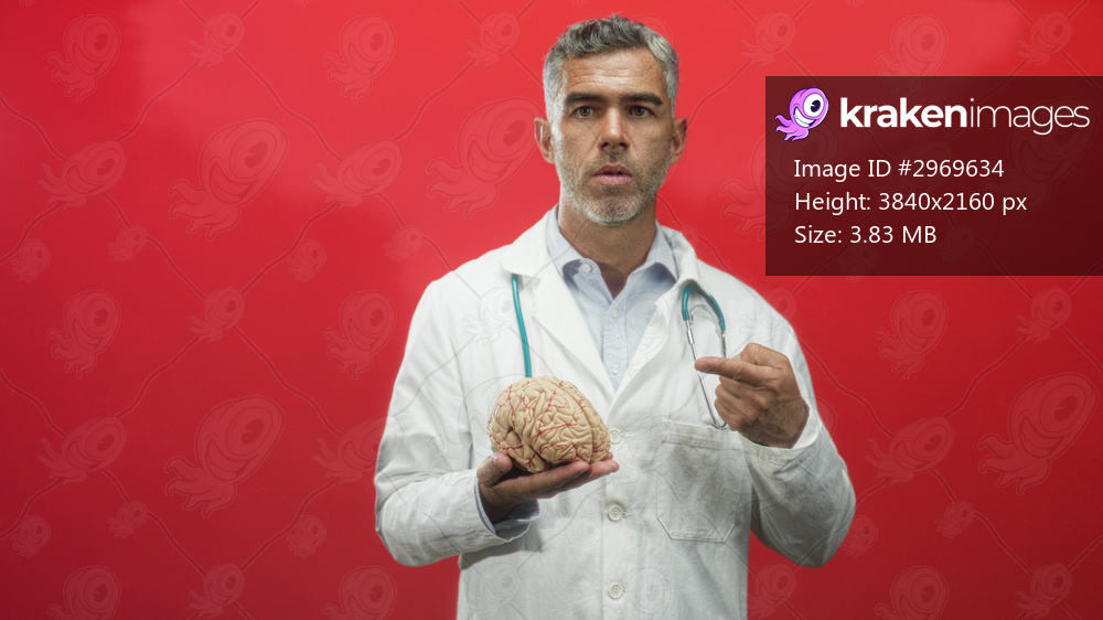 Man doctor in white labcoat holds a brain model and points finger to brain in studio; education serious.
