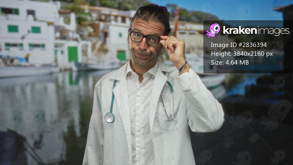 Man doctor with long hair in white coat adjusts glasses beside harbor building; contemplation dedication.