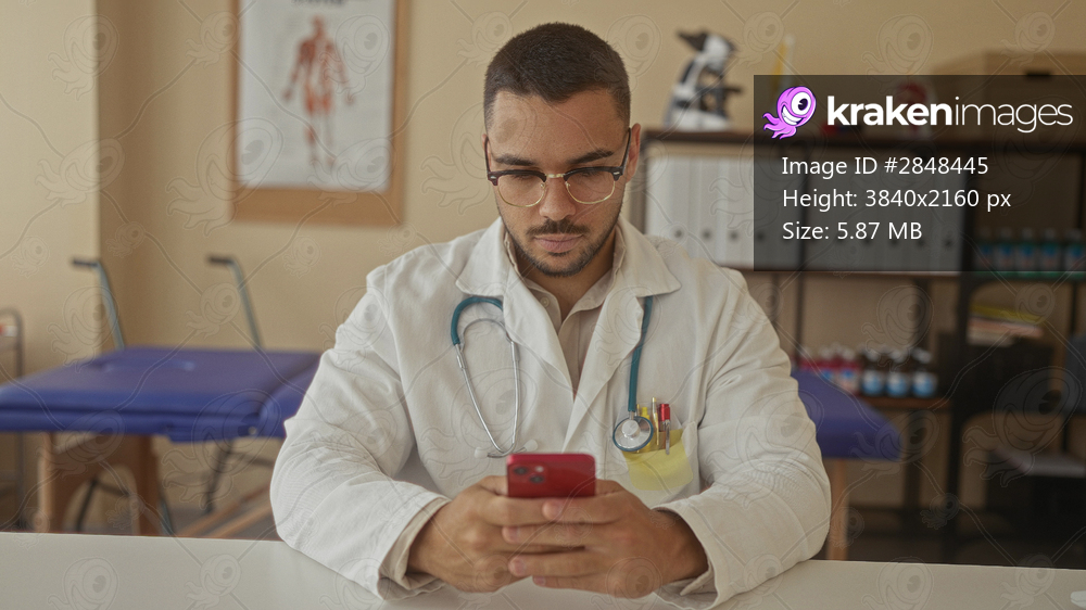 Man doctor looks at red smartphone while seated at a desk in clinic, stethoscope draped over his shoulders; professionalism.