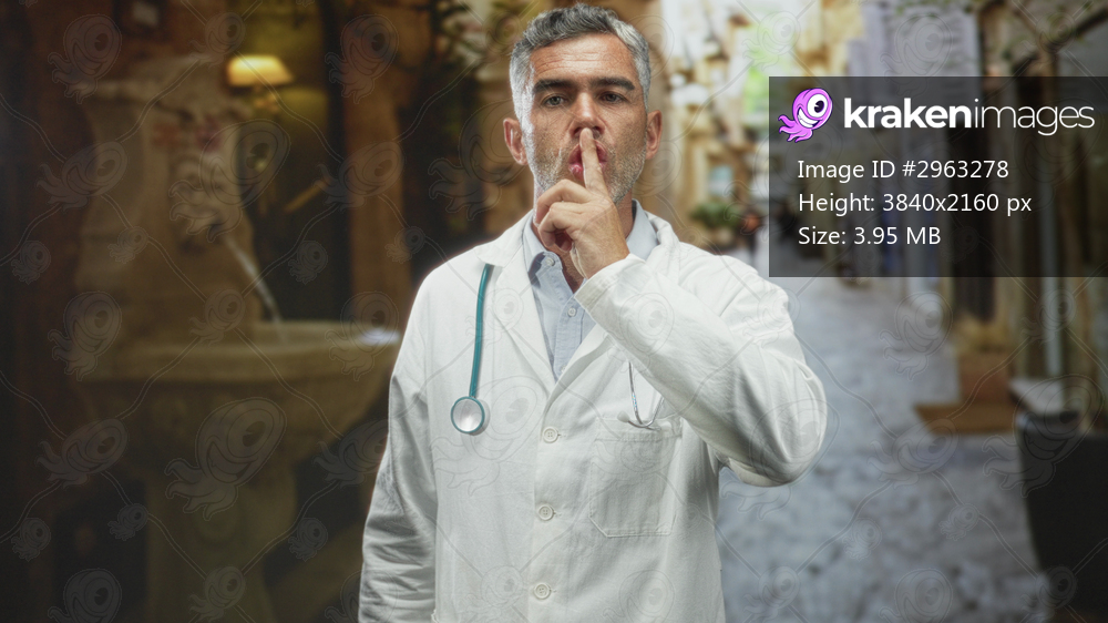 Man doctor middle age grey hair in white coat with stethoscope, finger to lips for silence on a narrow cobblestone street; calm reassurance.