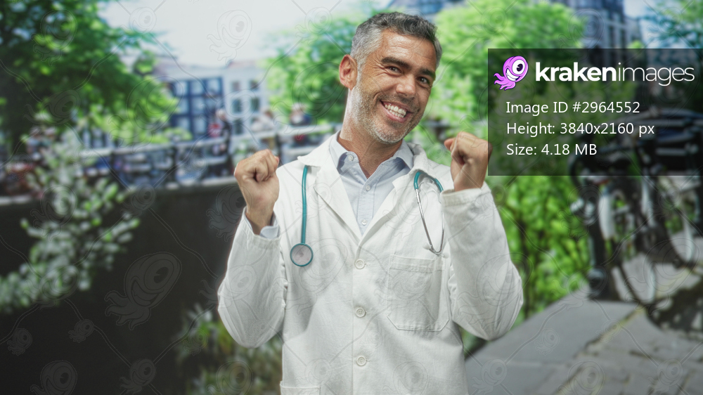 Man doctor middle age grey hair wearing white coat and stethoscope raises clenched fists and smiles on a city street; joy success.
