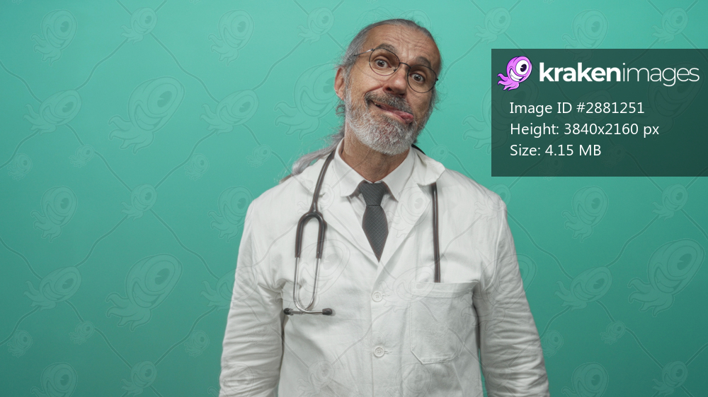 Man doctor, middle age with hoary long hair and glasses, wearing white coat and stethoscope, laughing with mouth open and tongue out in teal studio; playful compassion. - Kraken Images