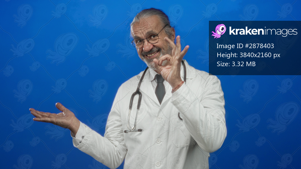 Man doctor points finger to open hand in studio against blue backdrop; health advice wellness confidence.