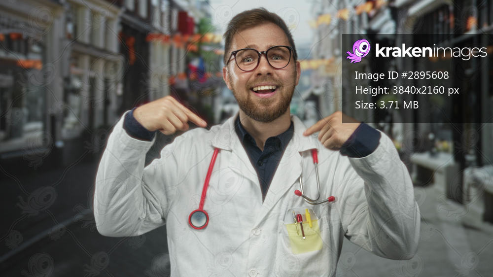 Man doctor with red stethoscope pointing to chest on a city street, smiling and gesturing to himself; trust care confident.