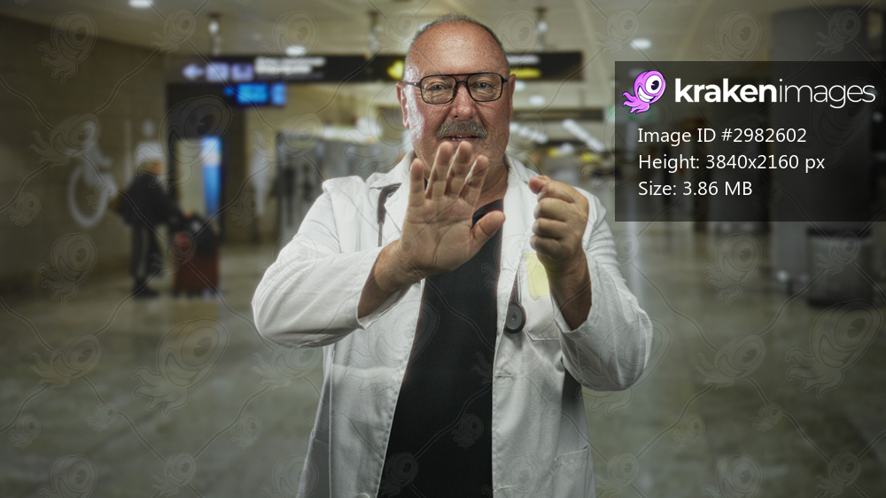 Man doctor senior in white coat holds stethoscope and raises hand palm forward as if signaling stop in busy airport corridor; caution safety care.