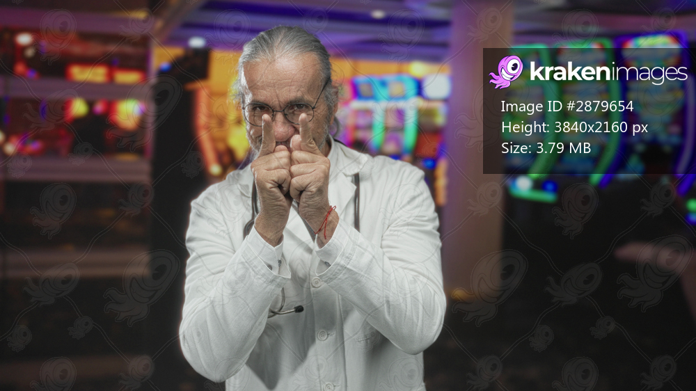Man doctor with stethoscope clenches fists to chest by slot machine in casino building while smiling; joy healing compassion.