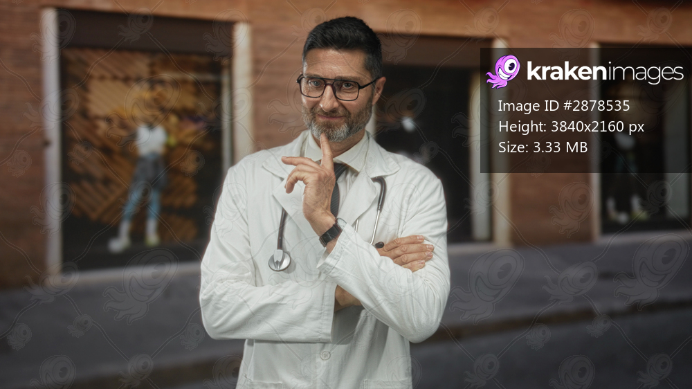 Man doctor with stethoscope, finger to lips for silence on street near storefront; trust compassion.
