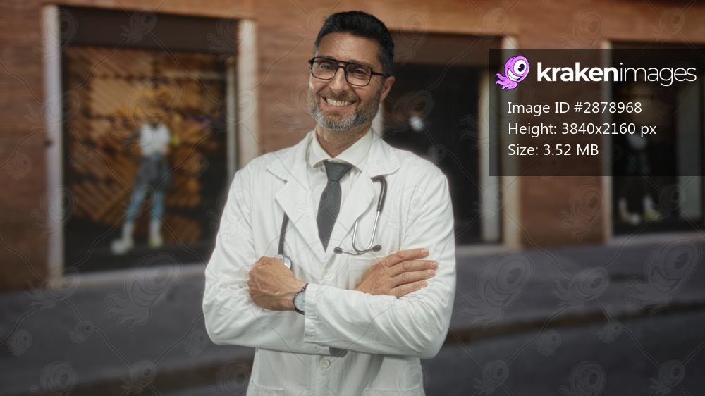 Man doctor with stethoscope, finger to lips for silence on street near storefront; trust compassion.