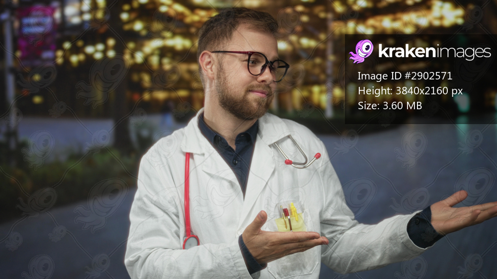 Man doctor with stethoscope gesturing open hands on city street at night wearing white coat and glasses; confidence professionalism.