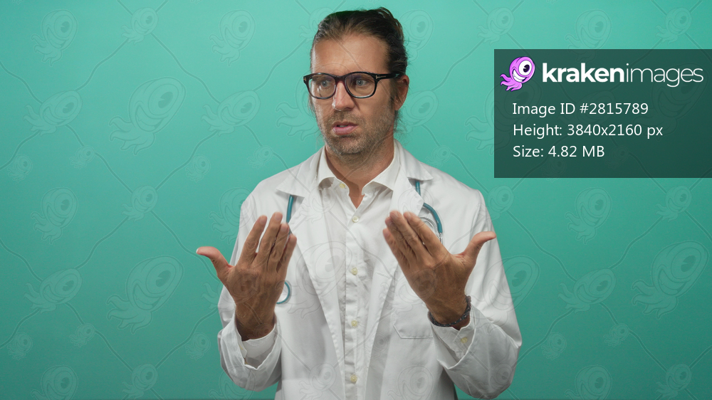 Man doctor with stethoscope and glasses raises palms in teal studio, his long blond hair pulled back; confusion.