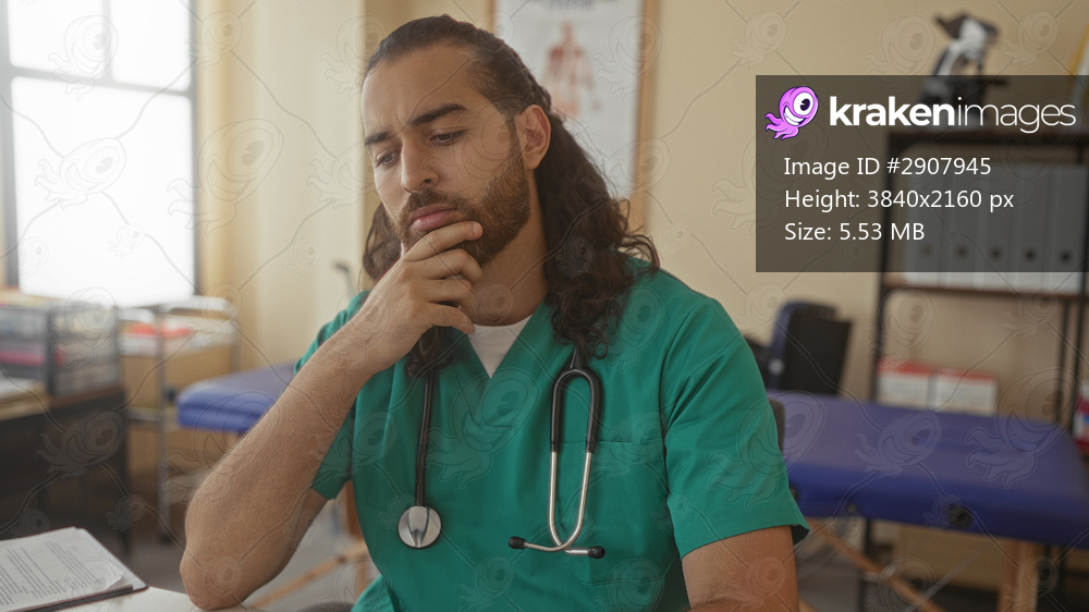 Man doctor with stethoscope hand on chin pensive at clinic desk reviewing patient notes and chart; clinical concern.