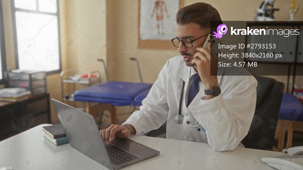 Man doctor with stethoscope holds phone to ear and types on laptop at desk in building; professionalism focus dedication efficiency.