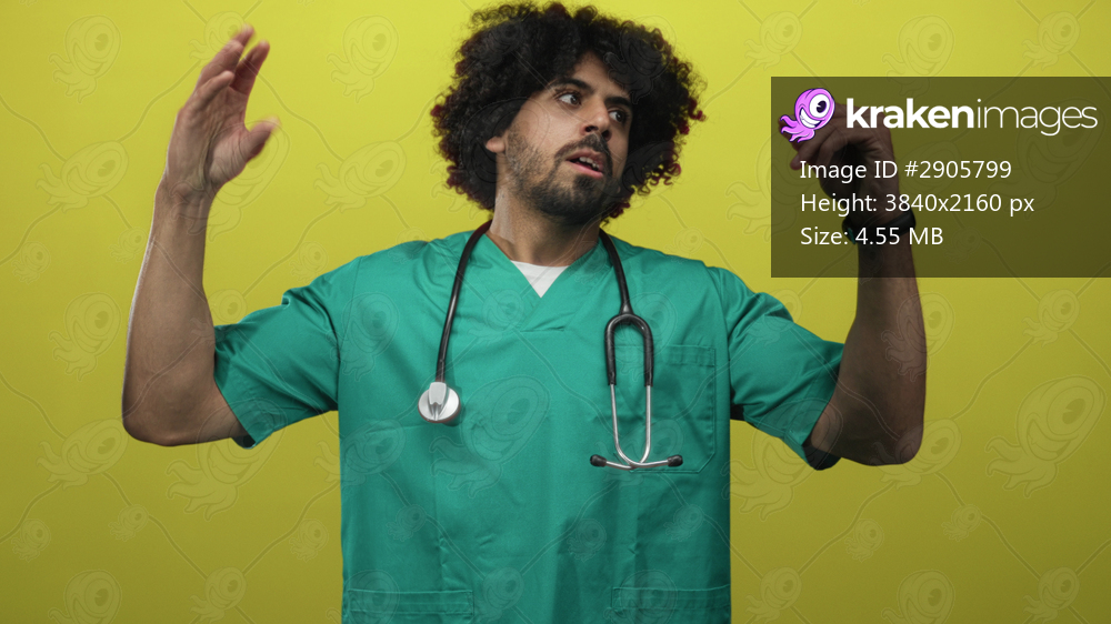 Man doctor with stethoscope in green scrubs and curly hair gesturing open hands in yellow studio setting; surprise explanation.