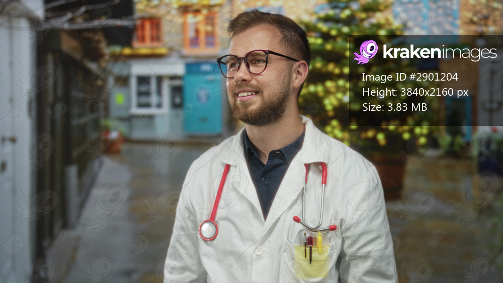 Man doctor with stethoscope and labcoat smiling and looking up on a wet street near a decorated storefront; hope care trust.