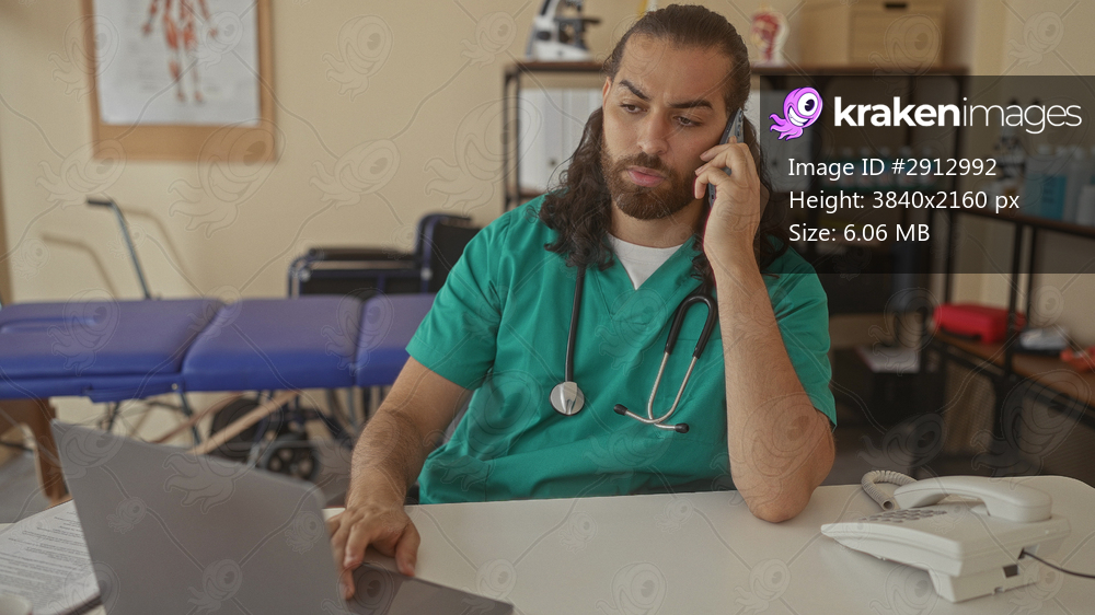 Man doctor with stethoscope on phone while checking laptop and notes in clinic room with treatment table and medical shelf; concern duty.