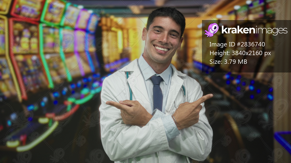 Man doctor with stethoscope pointing finger to slot machine beside neon slot rows in casino building; humor.