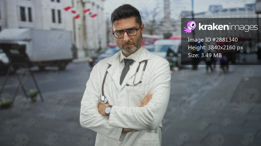 Man doctor with stethoscope standing with arms crossed on a city street wearing white coat and tie; confidence duty.