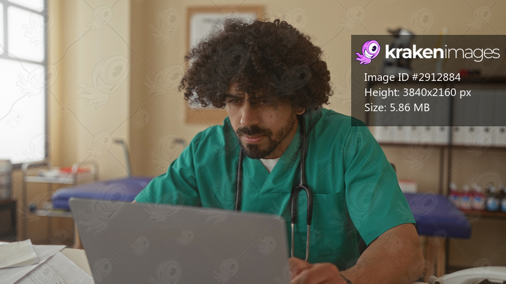 Man doctor with stethoscope typing on laptop in clinic building while seated at desk and reviewing notes; focused care.