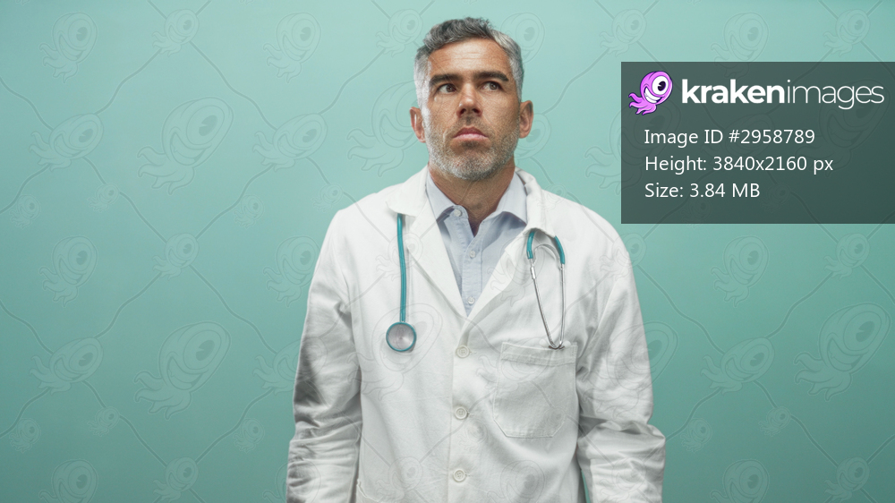 Man doctor with stethoscope and visible face looking sideways, hands at sides in studio; thoughtful reflection.