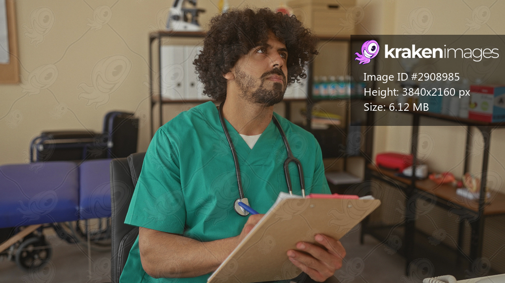 Man doctor with stethoscope writing on clipboard in clinic building, seated at desk and checking notes; focused care.