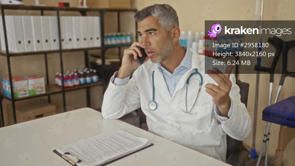 Man doctor talking on phone wearing stethoscope at clinic building, gesturing with hand over documents; concern duty.