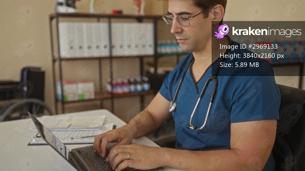 Man doctor typing on laptop with stethoscope at clinic desk inside building; clinical care concentration.