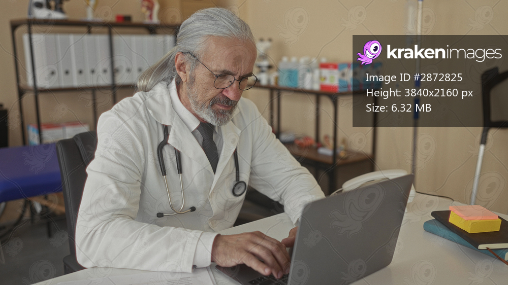 Man doctor typing on laptop with stethoscope at clinic desk inside building; patient care records concern.