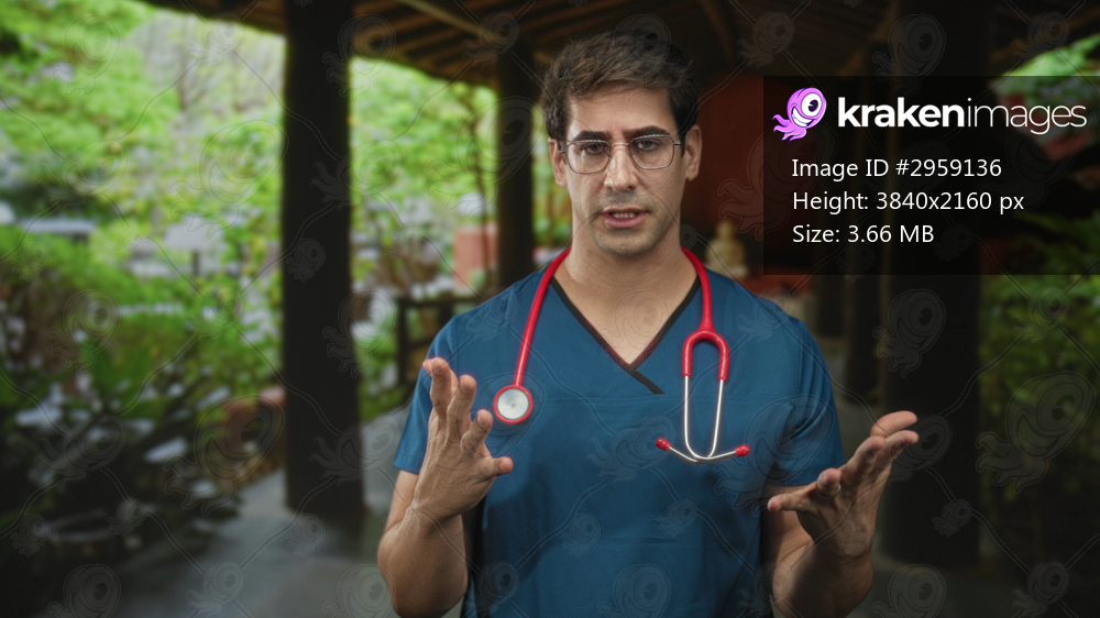 Man doctor wearing blue medical scrubs and glasses with a red stethoscope gesturing with open hands and looking upward inside a building corridor lined with greenery; relief dedication. - Kraken Images