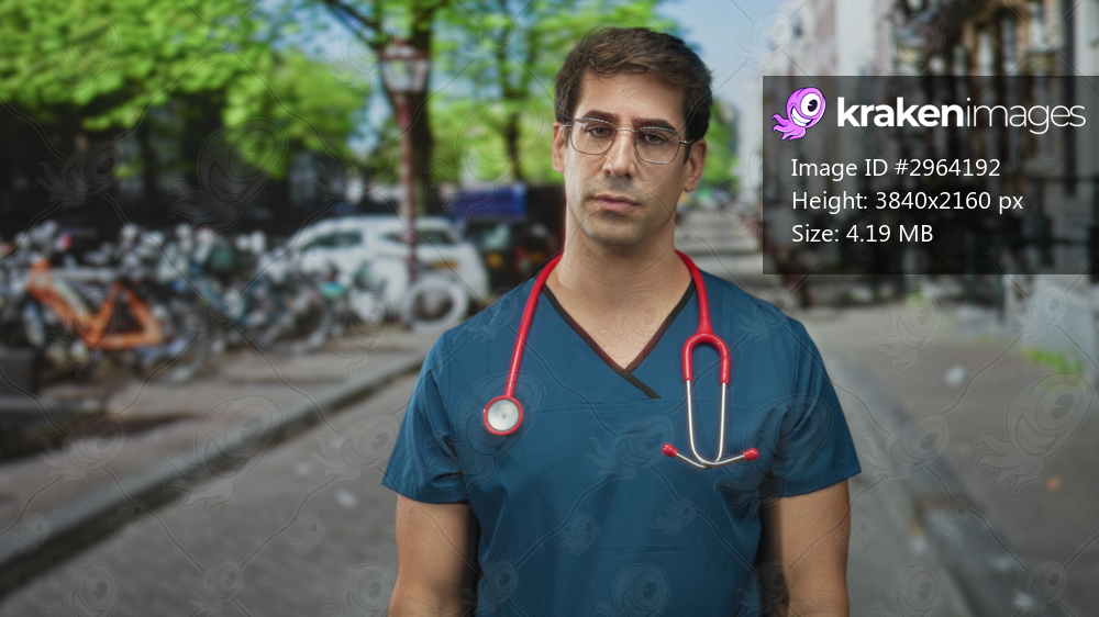 Man doctor wearing blue scrubs and red stethoscope gesturing with hands on street; compassionate care contemplative.