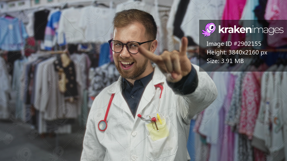 Man doctor wearing lab coat and stethoscope flashing rock horns gesture amid clothing stalls in street market; playful care.