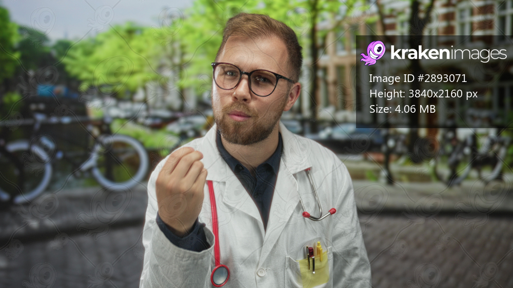Man doctor wearing lab coat and stethoscope gesturing with hand on street in amsterdam; concern health advice.