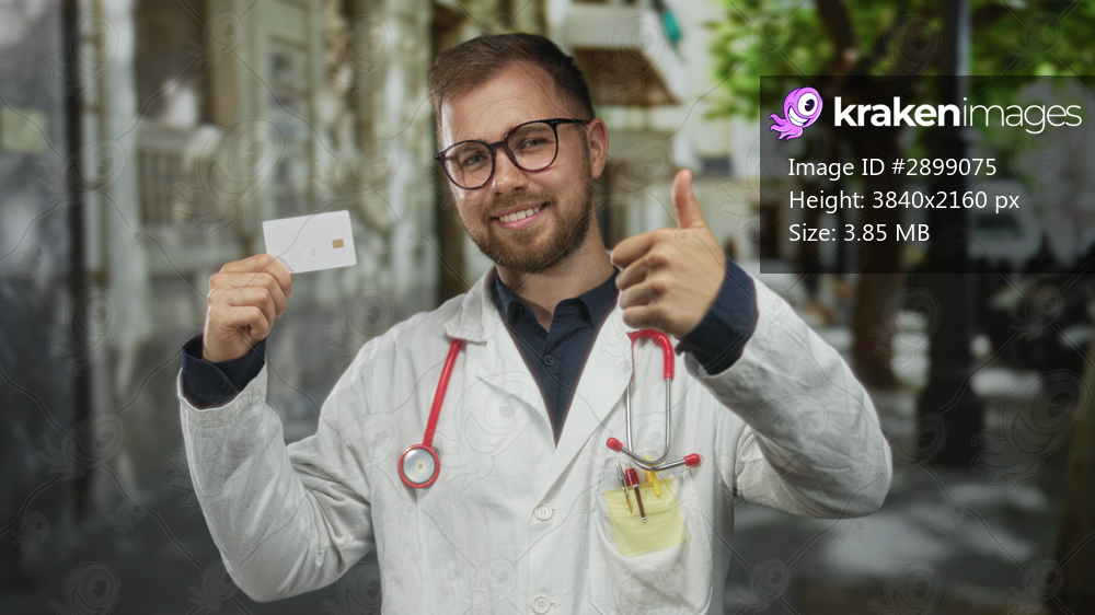 Man doctor wearing lab coat and stethoscope holding white card and giving thumbs up on busy city street; health trust confidence.