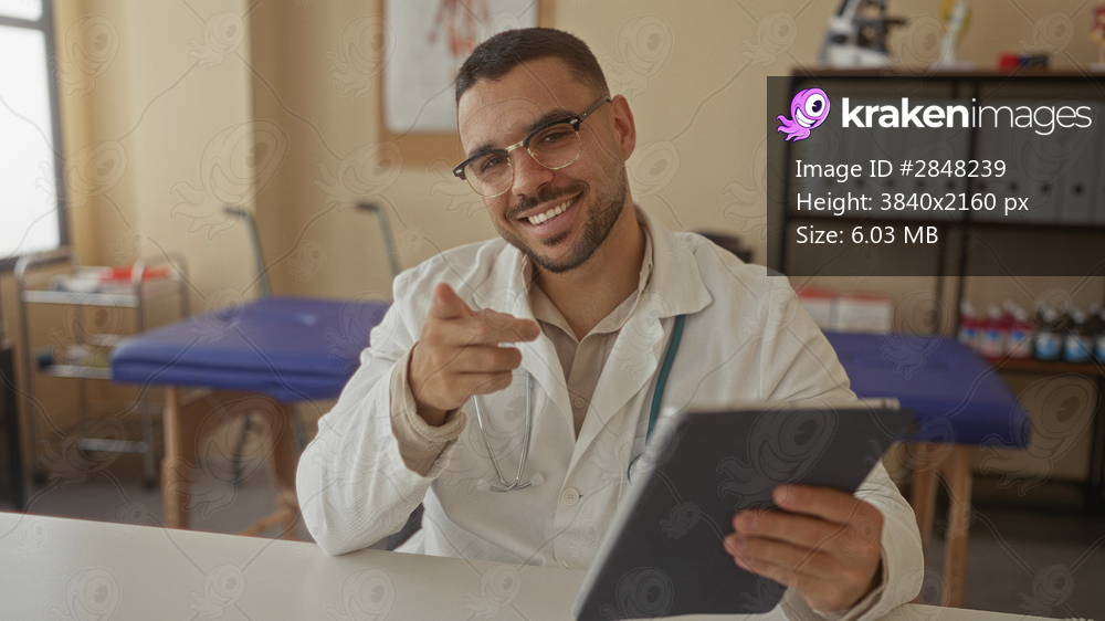 Man doctor wearing stethoscope and glasses seated at desk reading tablet in clinic; professional confidence.