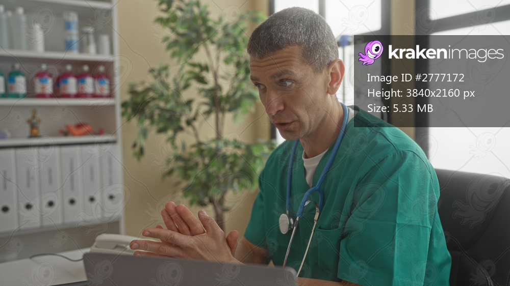 Man doctor wearing uniform with stethoscope in hospital clinic room engaged in discussion indicating focus on healthcare scene with medical tools and files visible indoors. - Kraken Images