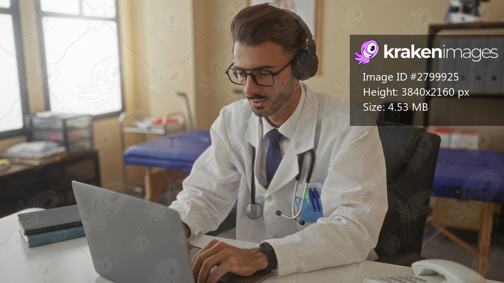 Man doctor wearing white coat stethoscope and headphones typing on laptop at clinic desk; focused professionalism.