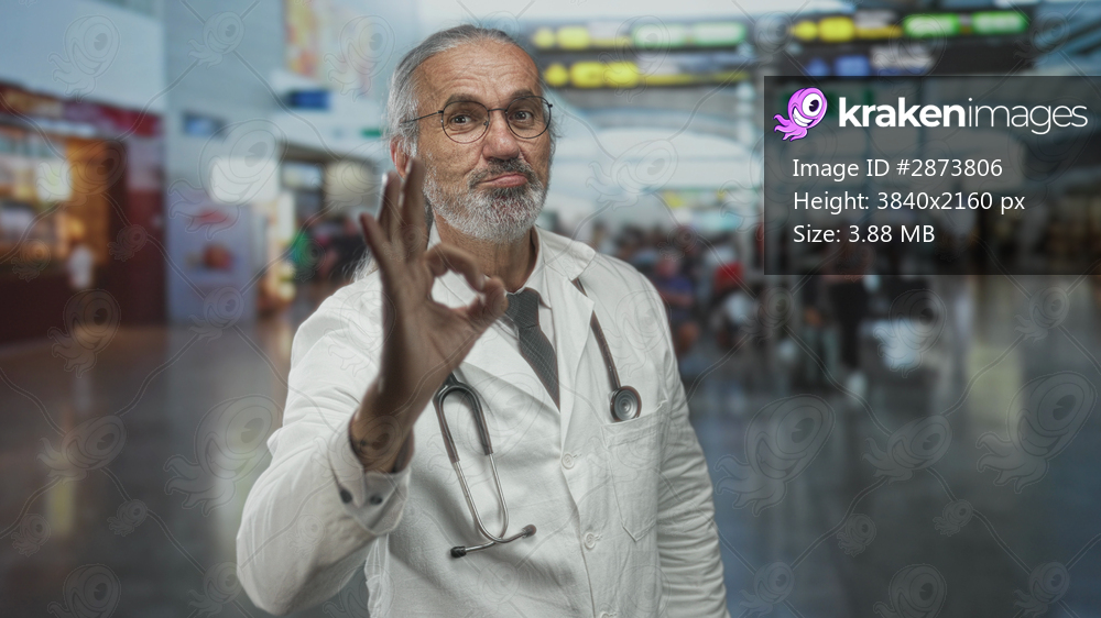 Man doctor wearing white coat and stethoscope makes ok sign with hand in airport terminal; reassurance health trust.