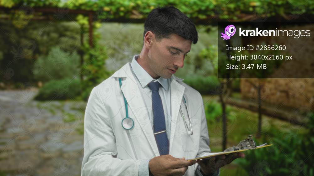 Man doctor wearing white coat and stethoscope makes ok sign in green park outdoors; approval confidence.