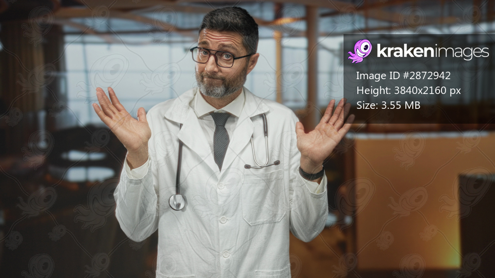 Man doctor wearing white coat and stethoscope shrugs hands in building lobby with tie and glasses; uncertainty concern.