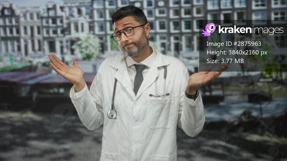 Man doctor wearing white coat and stethoscope shrugs shoulders with palms up in front of canal buildings on a street; uncertainty.