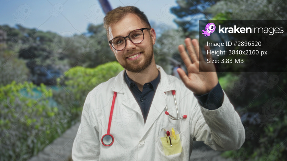 Man doctor wearing white coat and stethoscope waves right hand and smiles on forest path near green trees; friendly greeting.