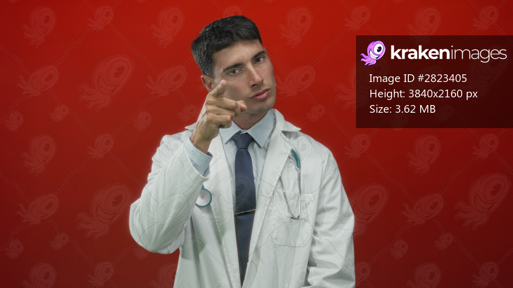 Man doctor wearing white coat and tie with closed eyes pointing finger with stethoscope in red studio; confidence.