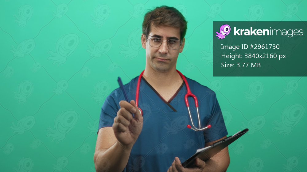 Man doctor writing on clipboard with red stethoscope and visible hand in studio; professional care concentration.
