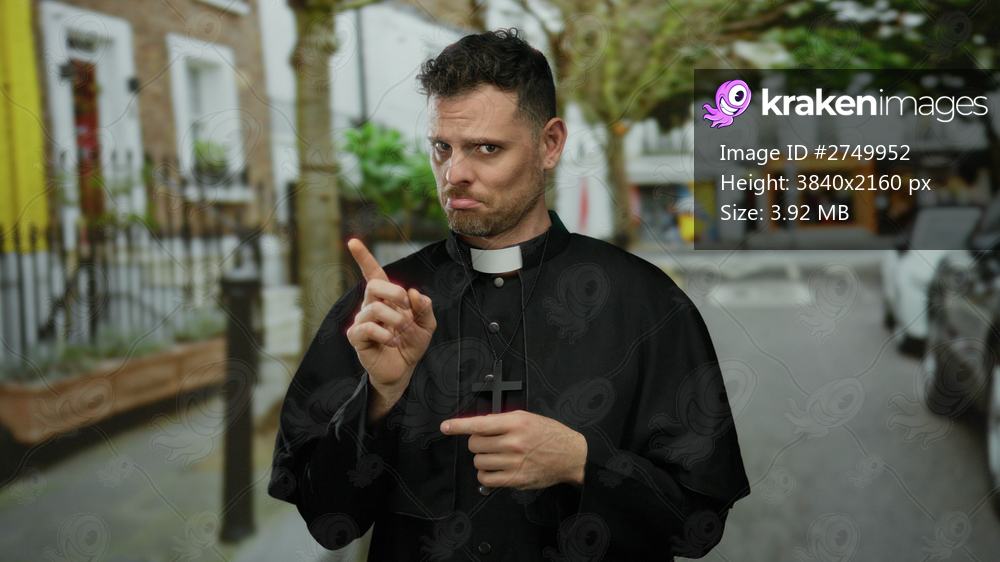 Man dressed as priest standing on urban street with humorous gesture in background of a cityscape, showcasing religious attire and casual demeanor.